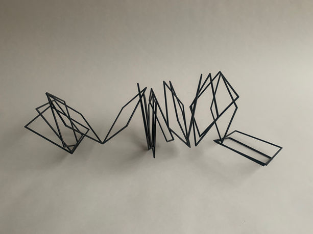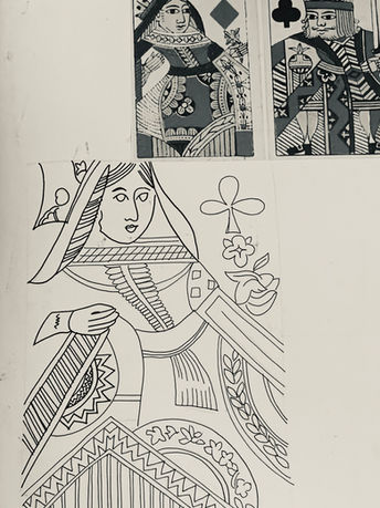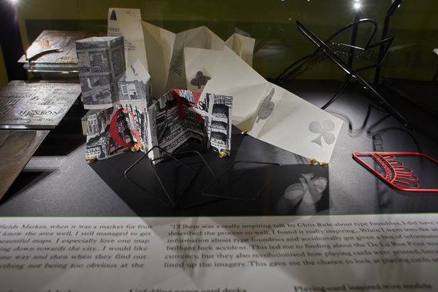 During one archival appointment researching Caslon, she was accidentally given a box on De La Rue Printers, a mistake that became a key moment of inspiration. Based at 110 Bunhill Row, these printers revolutionised playing card manufacture in the Victorian period, making them more affordable by patenting an easier method for aligning face cards and standardising designs. De La Rue’s vivid and whimsical designs highlighted the intricacy of cards’ symbols and illustrations, inspiring Jacky to explore abstract wirework and experiment with perspective.