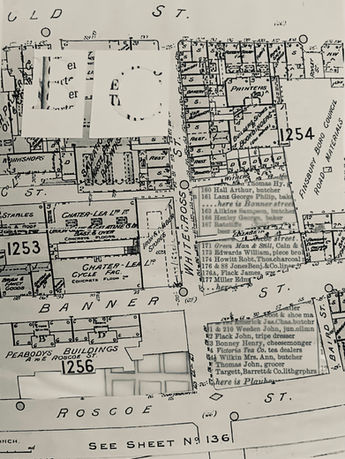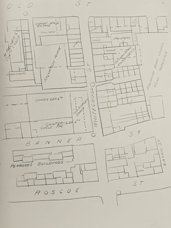 Jacky’s final artwork, Traces of Bunhill, is installed on buildings across Bunhill, creating enamelled windows into Bunhill’s past. Her collage-inspired process is clearly expressed in these pieces, with precisely extracted maps of buildings and blocks punching straight through to clipped sections of text or layers of other, older maps and building plans. These historic documents are clearly archival but displaced—centuries-old documents overlap and peek through modern materials, flattening time and bringing nineteenth century craftsmen, seventeenth century fields, and modern viewer into the same plane of existence. Her work suggests a continuum, reminding viewers that this place once belonged to someone else, that other feet walked these streets, and that we are part of a chain of overlapping but distinct moments in time.