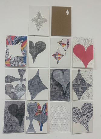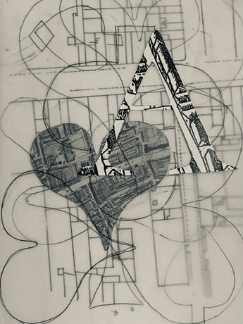 Jacky interleaved Caslon type and text drawn from maps and trade directories with photos and map sections. The playing cards were figured into keyholes that reveal layers of image and text, and inspired models of unfolding card decks that explored ways to view, hide, and revealed information through her art.